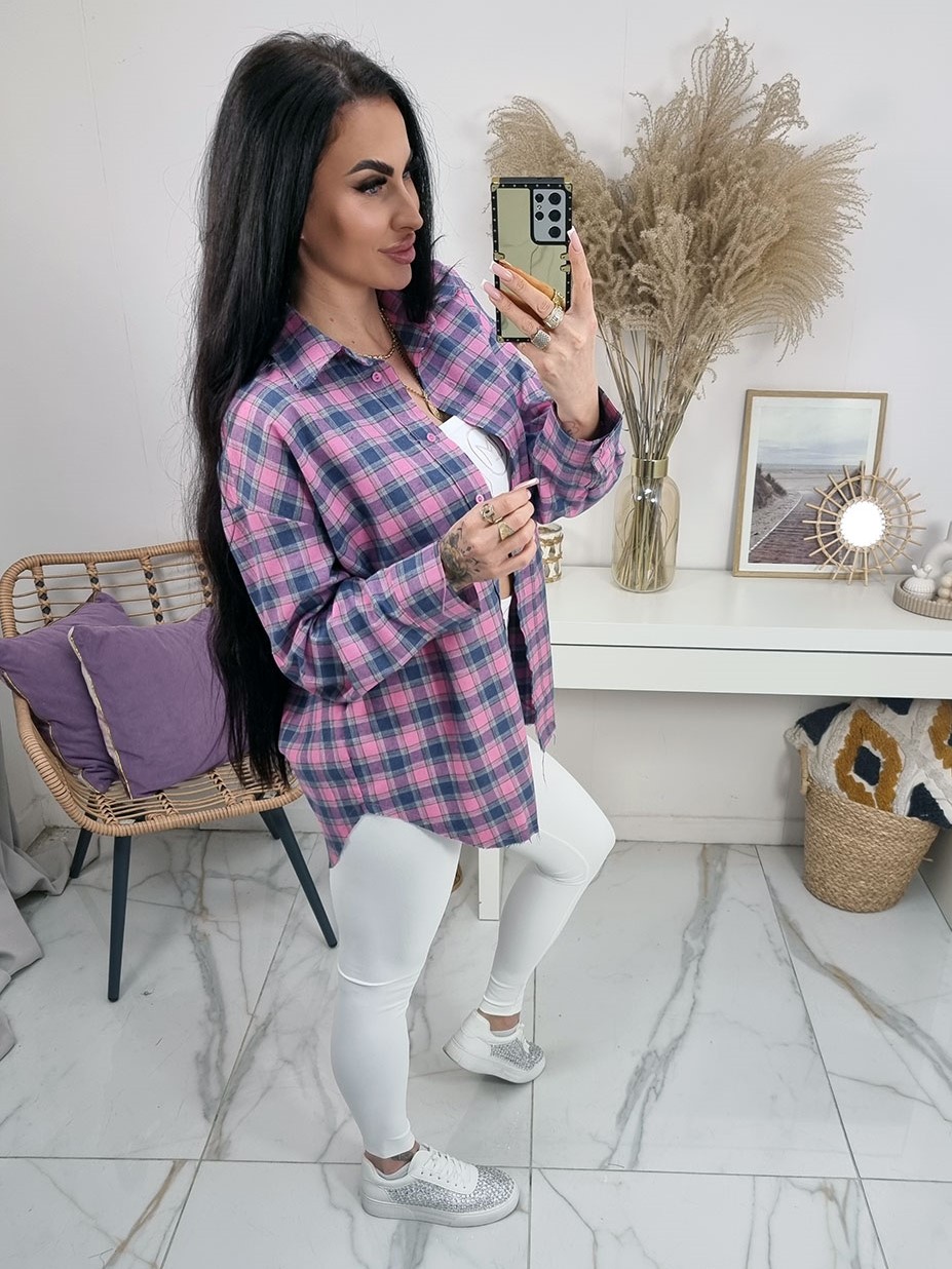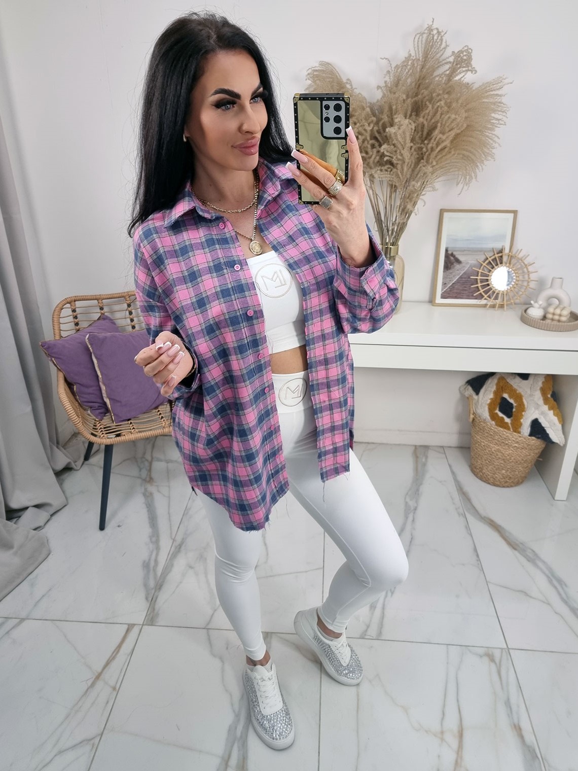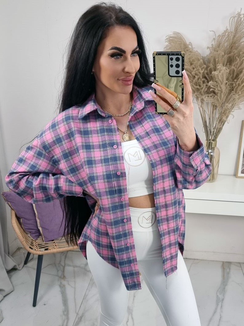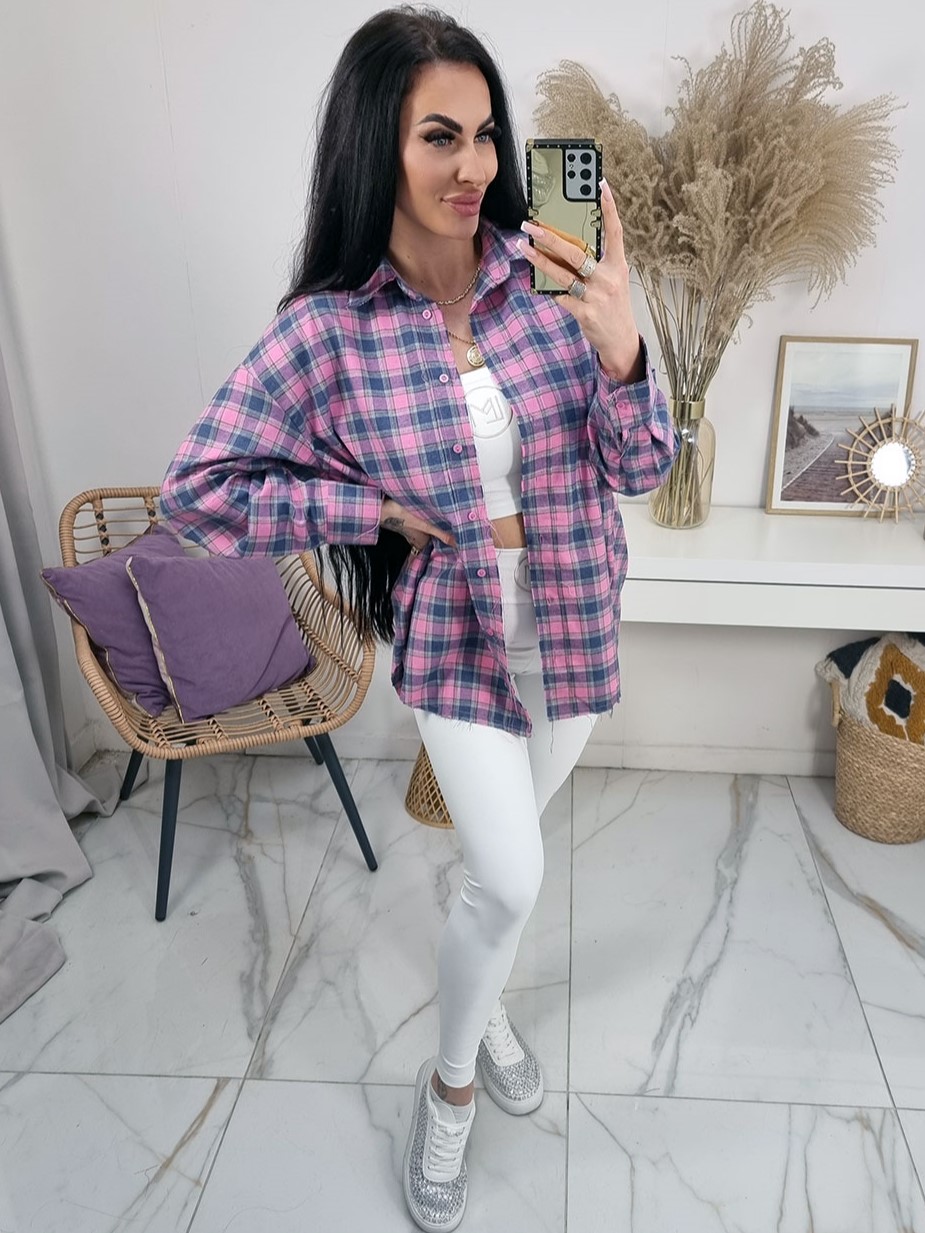 Stylowa koszula w modną kratę w odcieniach różu i fioletu lub granatu, wykonana z lekkiego i przyjemnego materiału - 100% bawełna. Idealna na co dzień, świetnie komponuje się z jeansami i sneakersami oraz z topem i legginsami, dodając każdej stylizacji casualowego charakteru. Luźny oversizeowy fason zapewnia komfort noszenia i swobodę ruchów. Must-have w kobiecej garderobie!