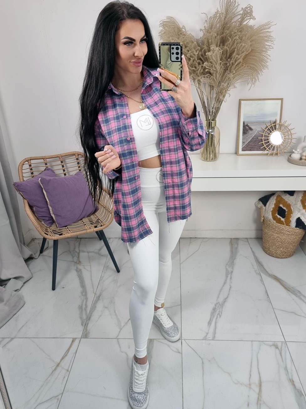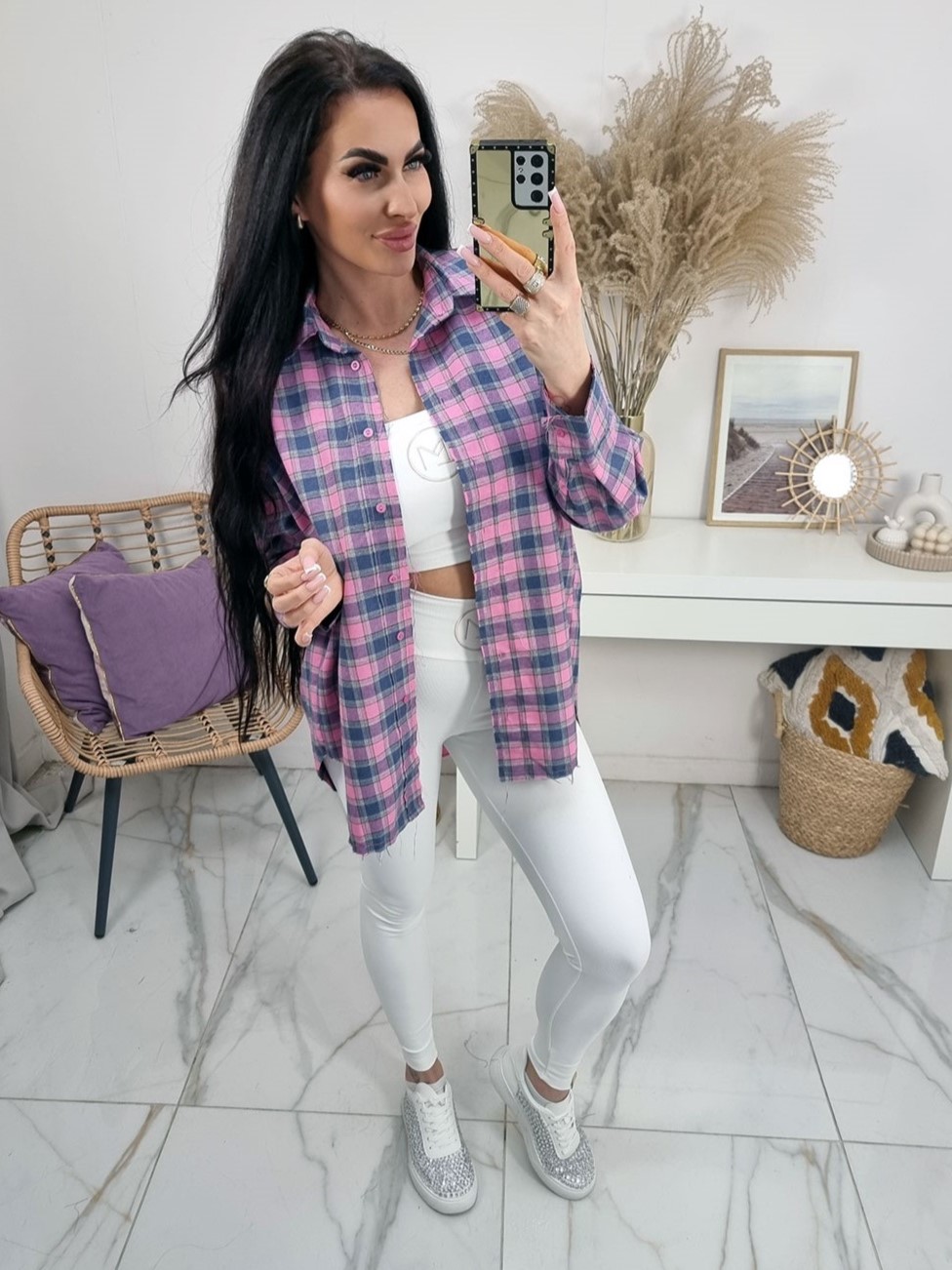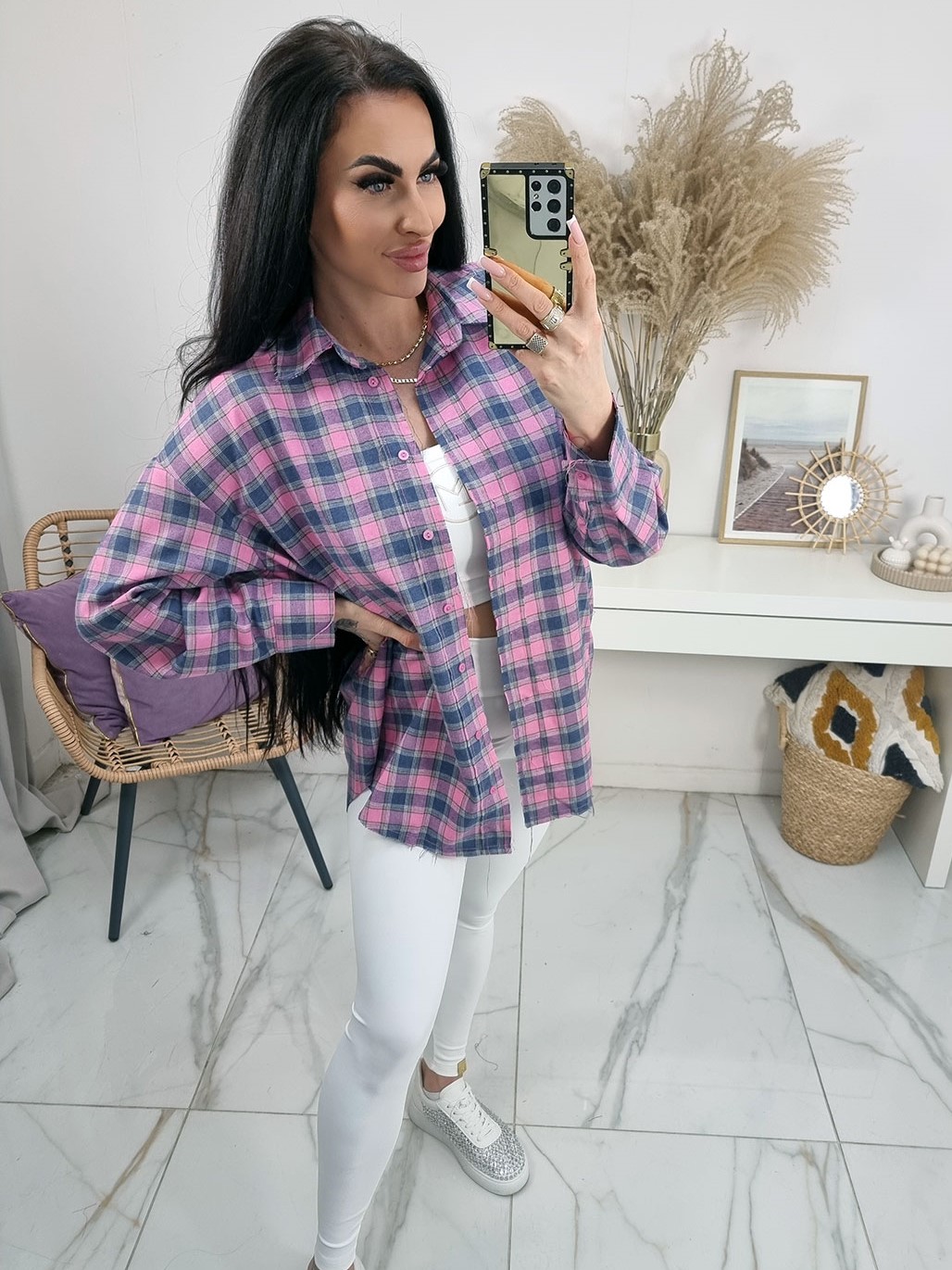 Stylowa koszula w modną kratę w odcieniach różu i fioletu lub granatu, wykonana z lekkiego i przyjemnego materiału - 100% bawełna. Idealna na co dzień, świetnie komponuje się z jeansami i sneakersami oraz z topem i legginsami, dodając każdej stylizacji casualowego charakteru. Luźny oversizeowy fason zapewnia komfort noszenia i swobodę ruchów. Must-have w kobiecej garderobie!