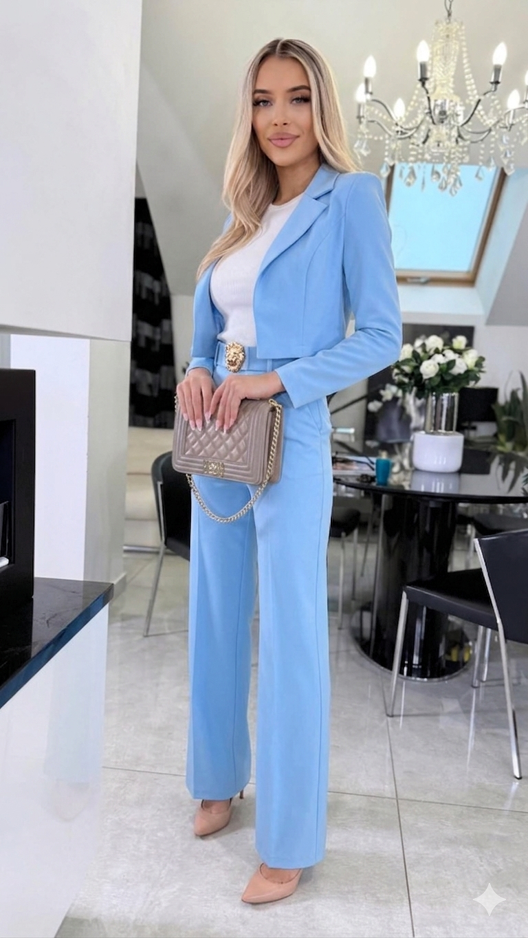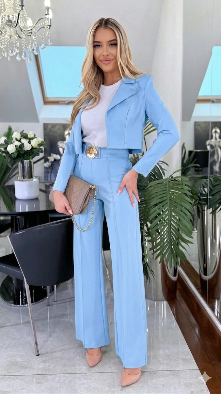 Damski elegancki garnitur Belluci komplet S.MORISS marynarka + spodnie z paskiem - błękitny baby blue