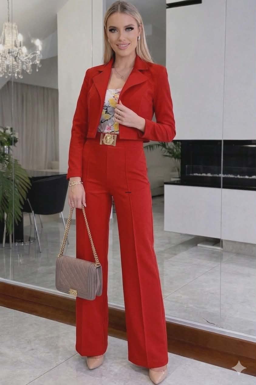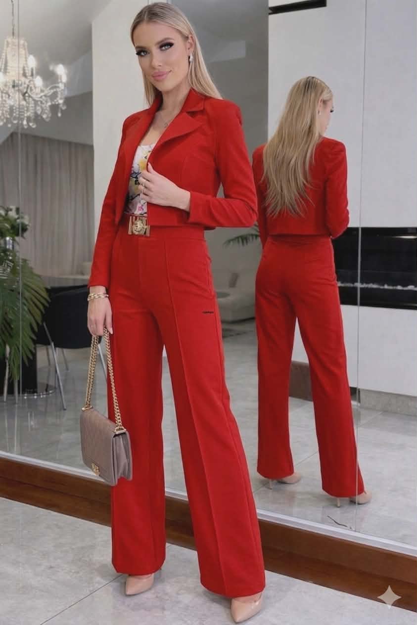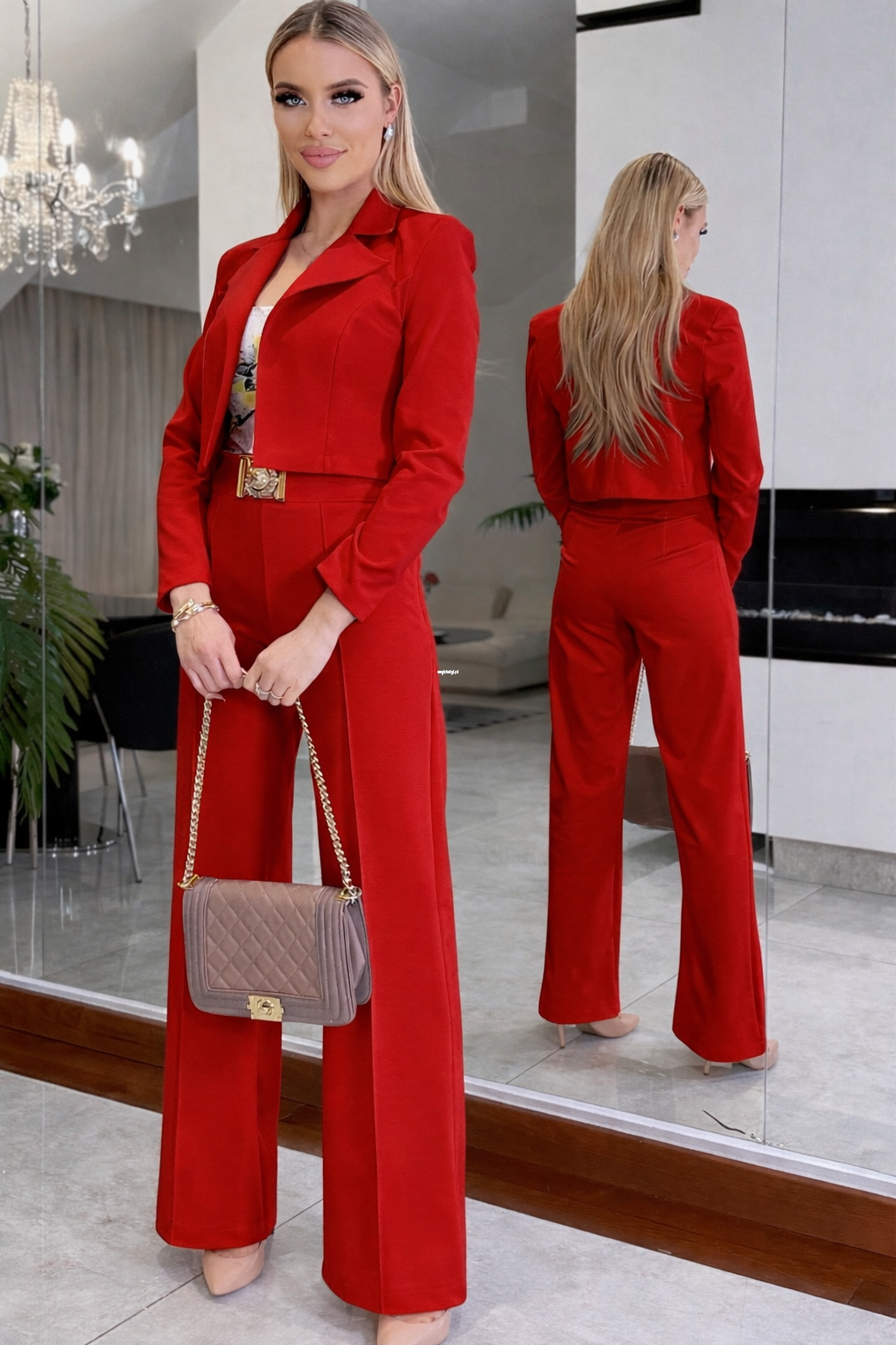 Damski elegancki garnitur Belluci komplet S.MORISS marynarka + spodnie z paskiem - czerwony