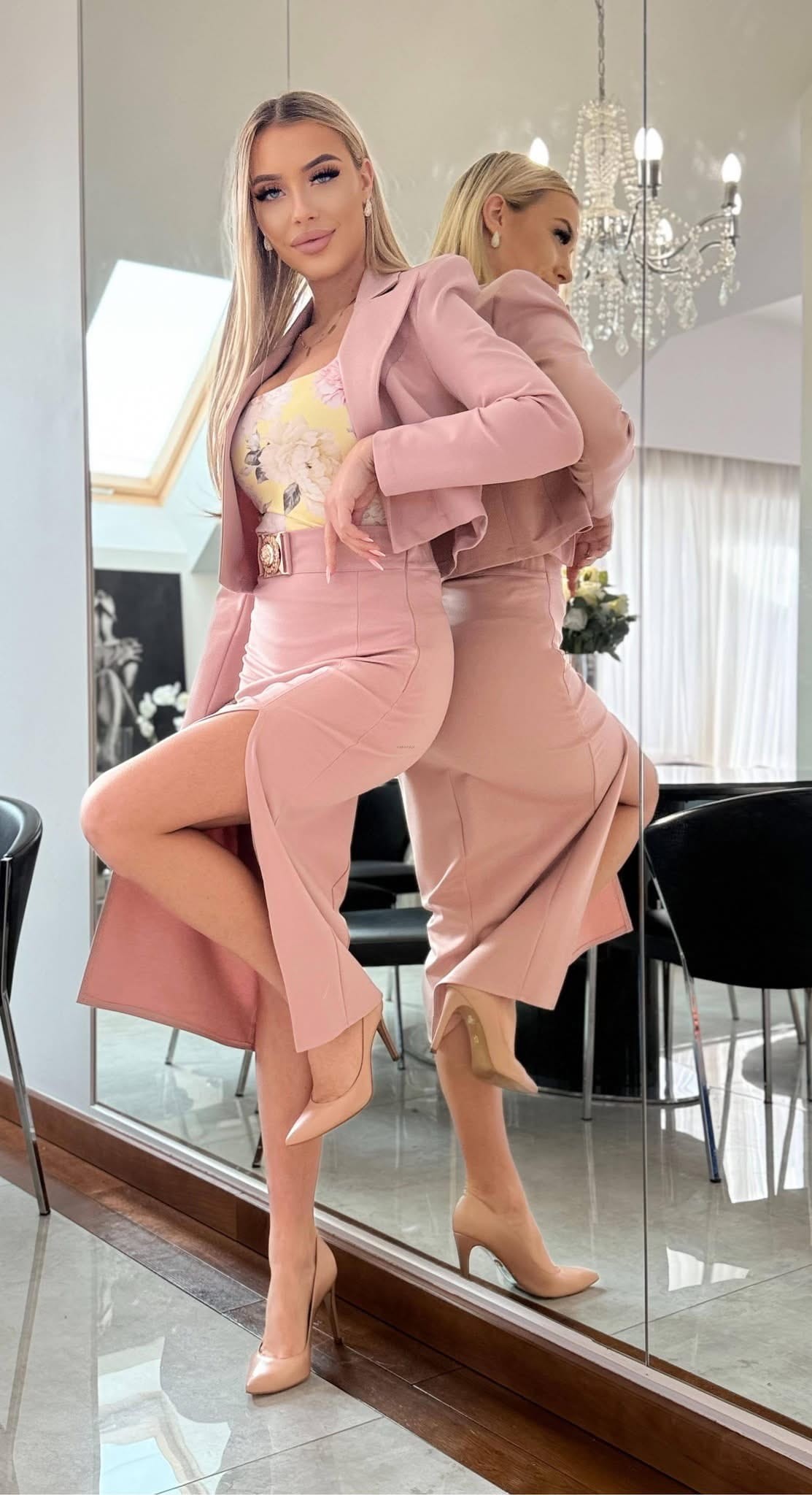 Damski elegancki komplet Sempre S.MORISS marynarka + spódnica z paskiem - brudny róż