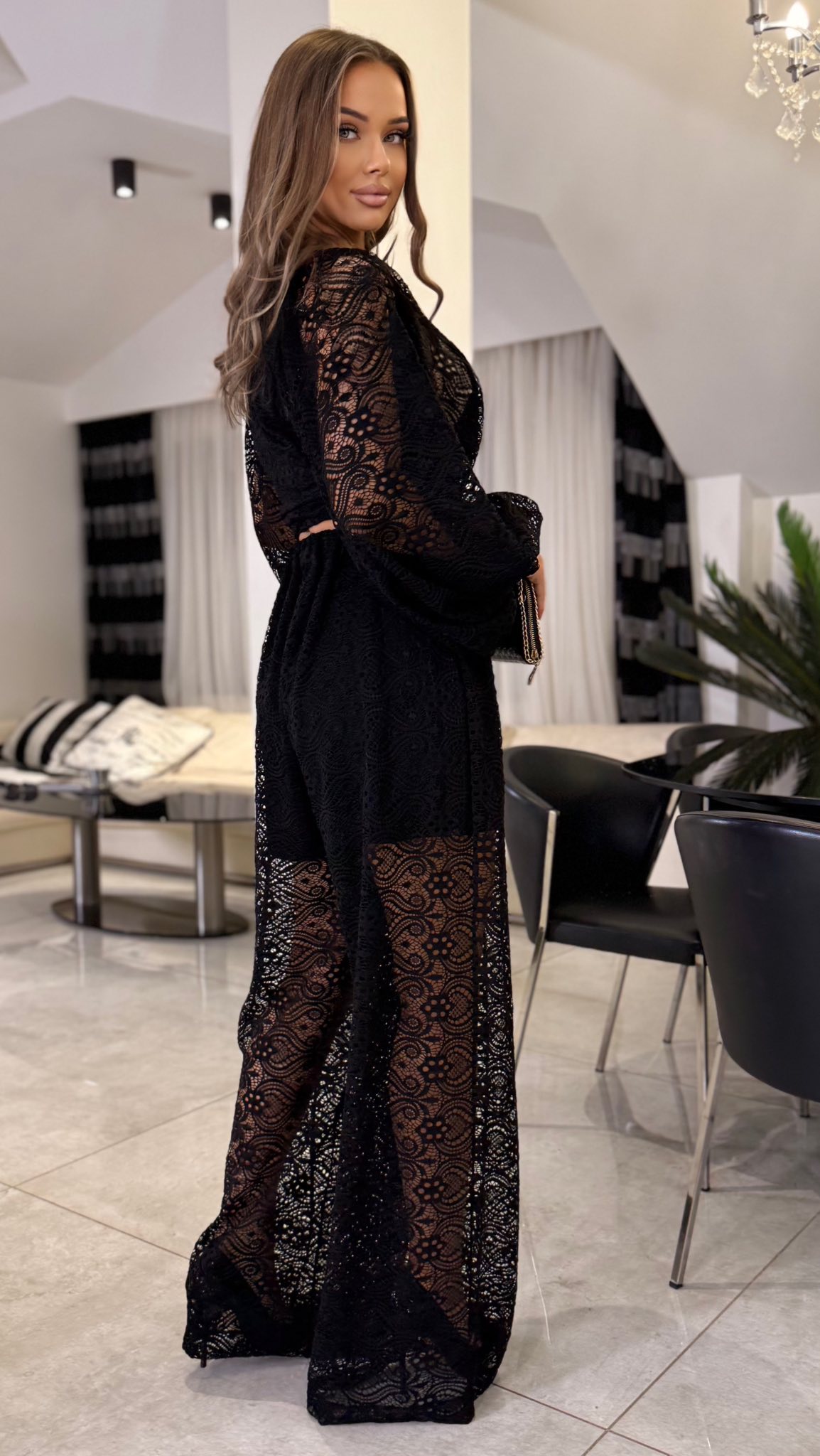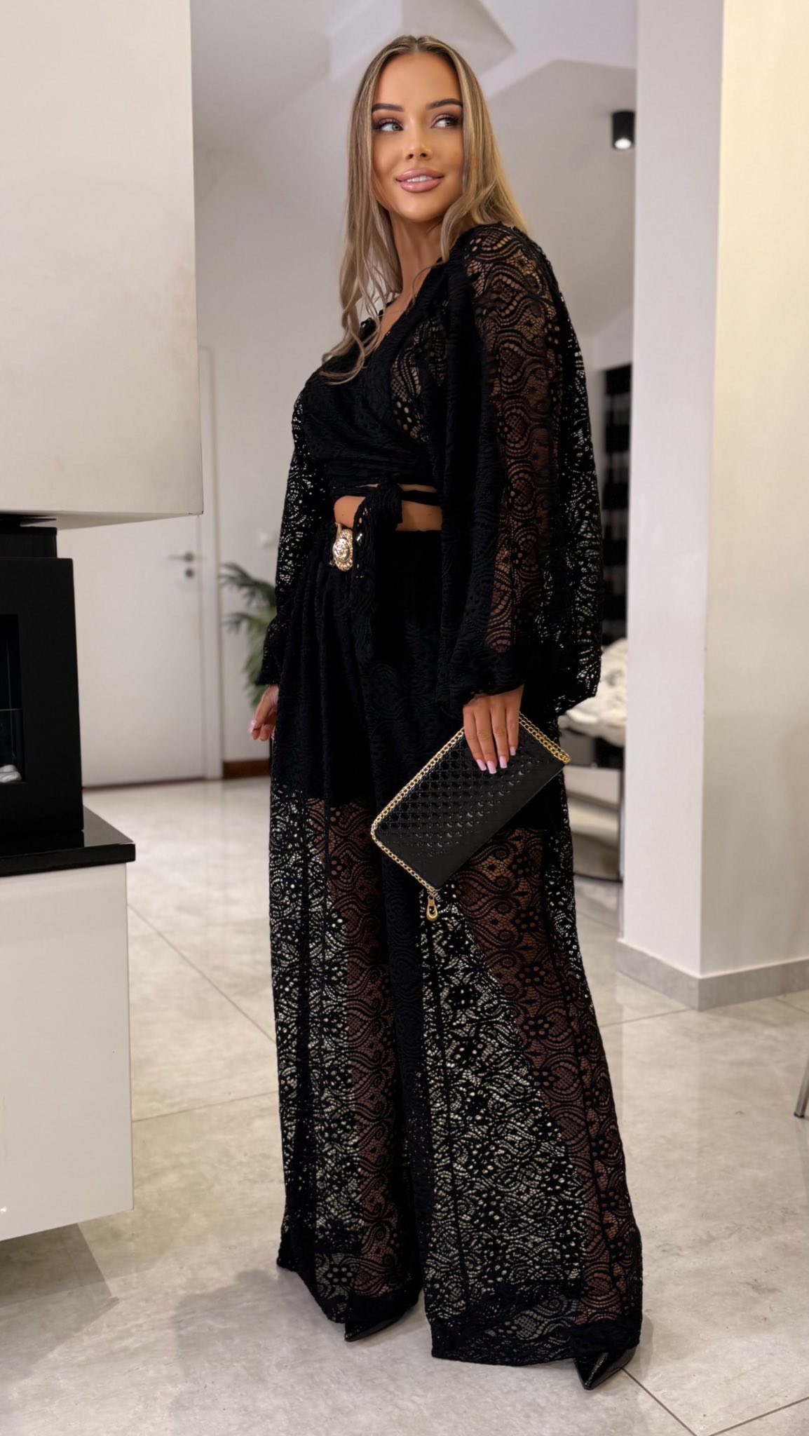 Damski koronkowy komplet S.MORISS bluzka + spodnie z klamrą - czarny