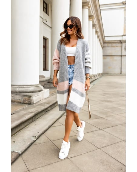 Długi sweter kardigan Doda w paski trikolor polski producent J&K premium - szary