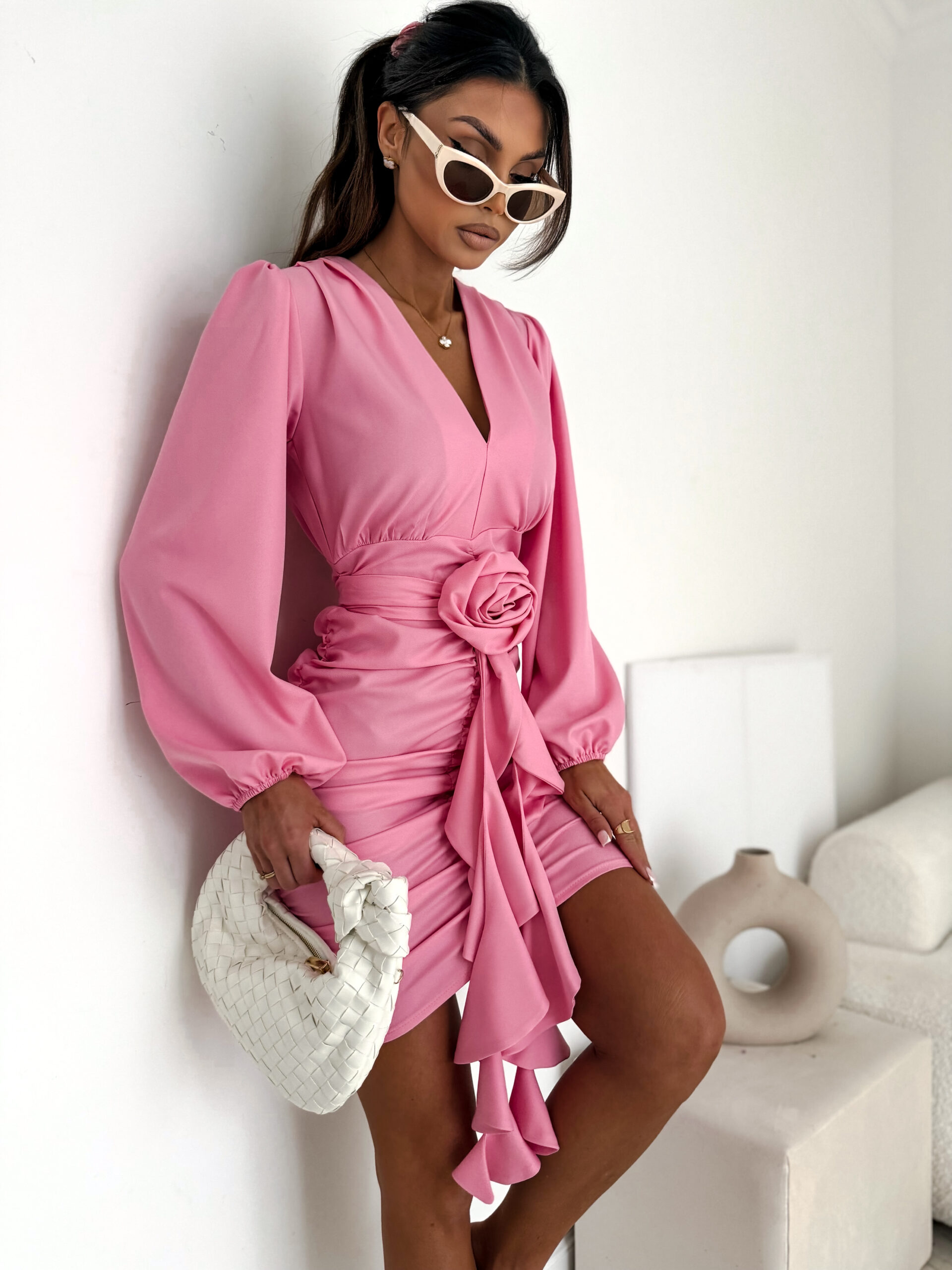 Elegancka sukienka Flowers z marszczeniem i różą polski producent Miluna Brand - cukierkowy róż