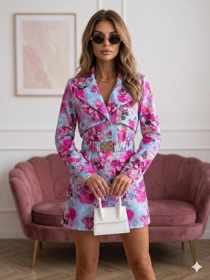 Elegancki Kombinezon Komplet Roses z paskiem i złotą klamrą - niebieski z fuksjowymi kwiatami