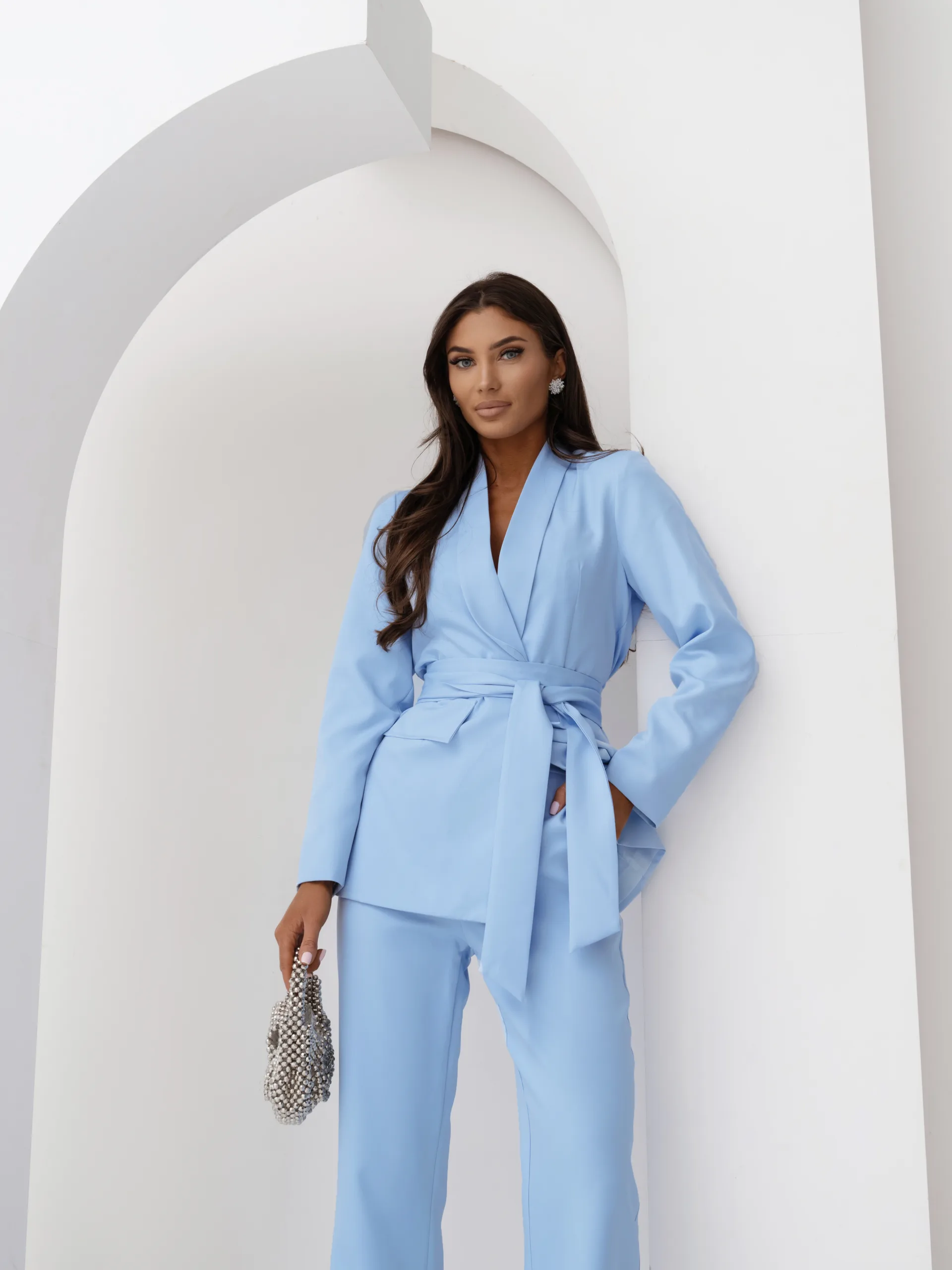 Klasyczny damski garnitur komplet z paskiem Tessa - baby blue błękitny