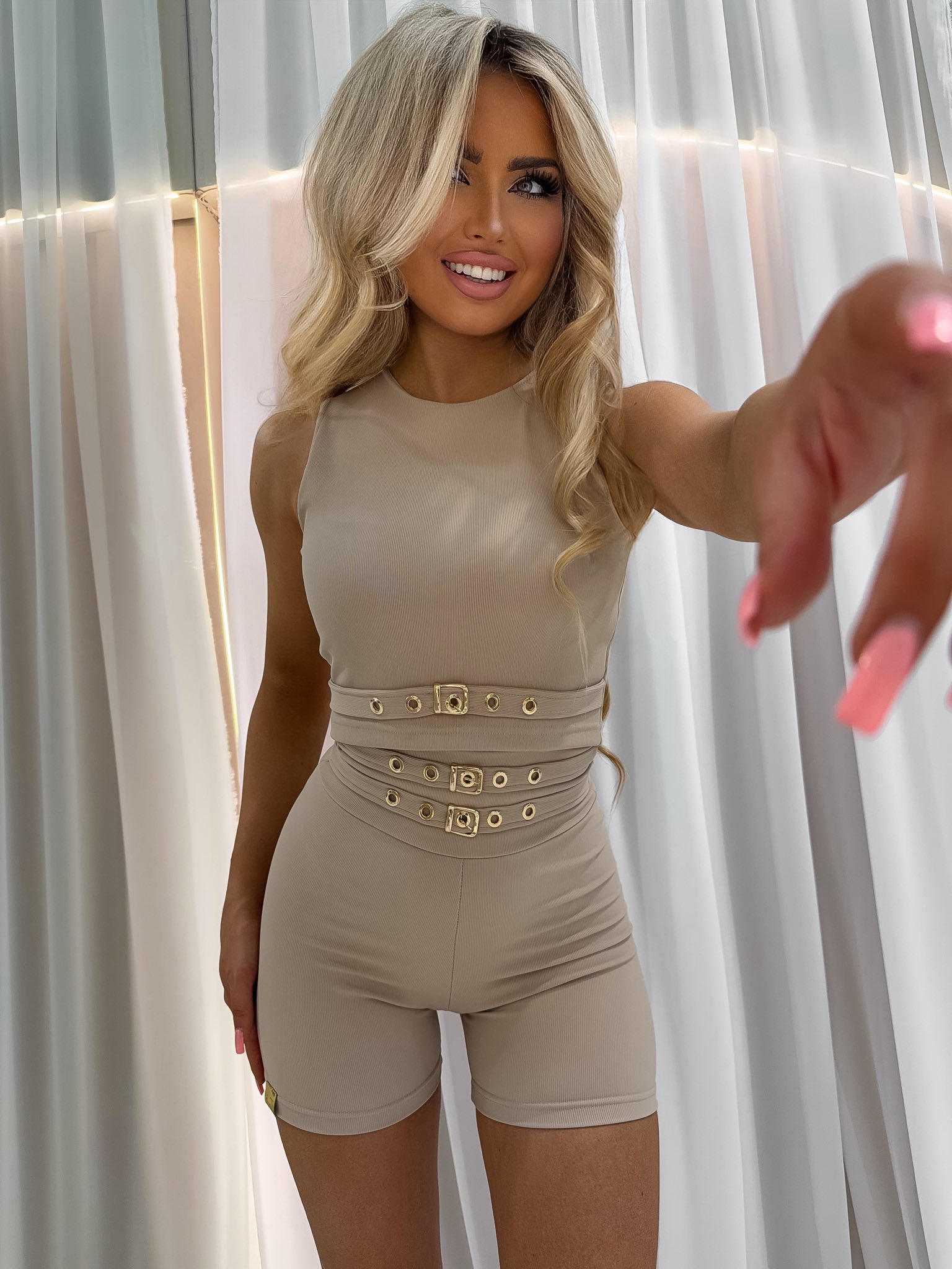 Kolarki legginsy Gold Stripe ze złotymi paskami i klamrami LA MONNE - beżowe