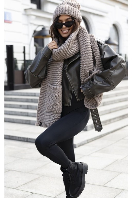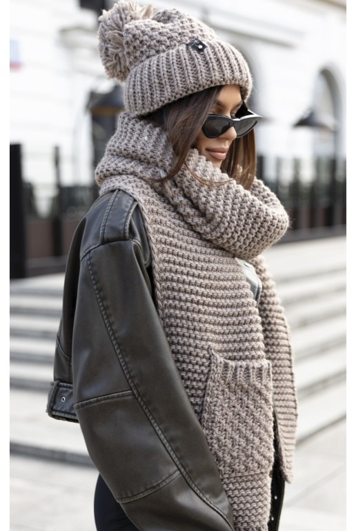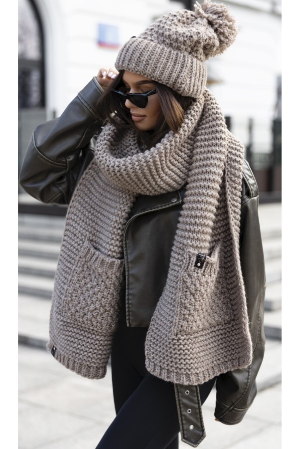Zestaw zawiera czapkę i szalik z kieszeniami o grubszym splocie.