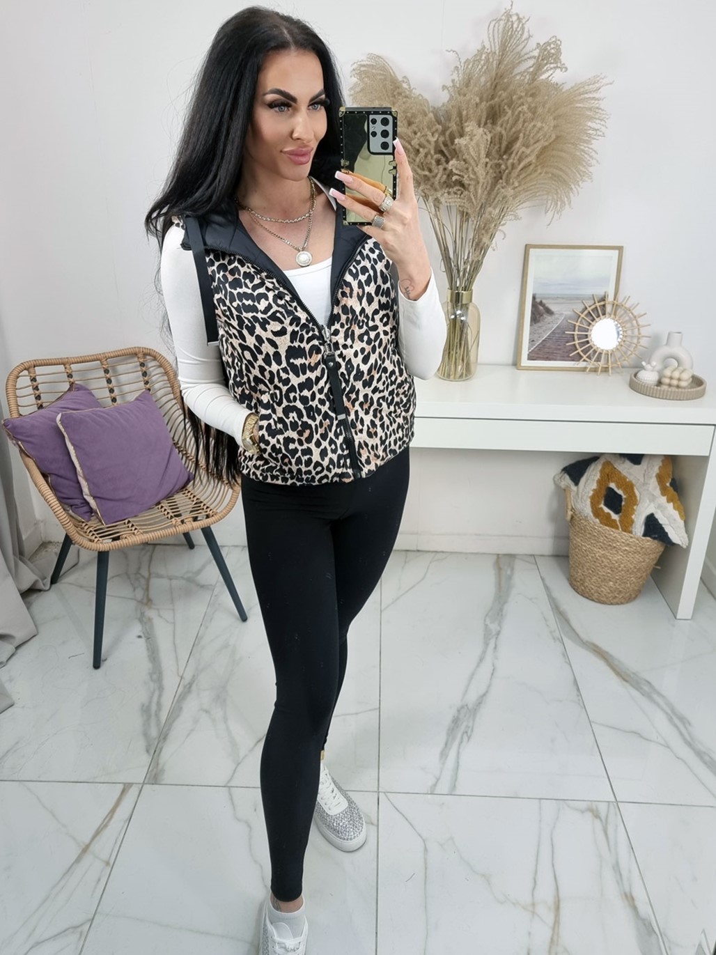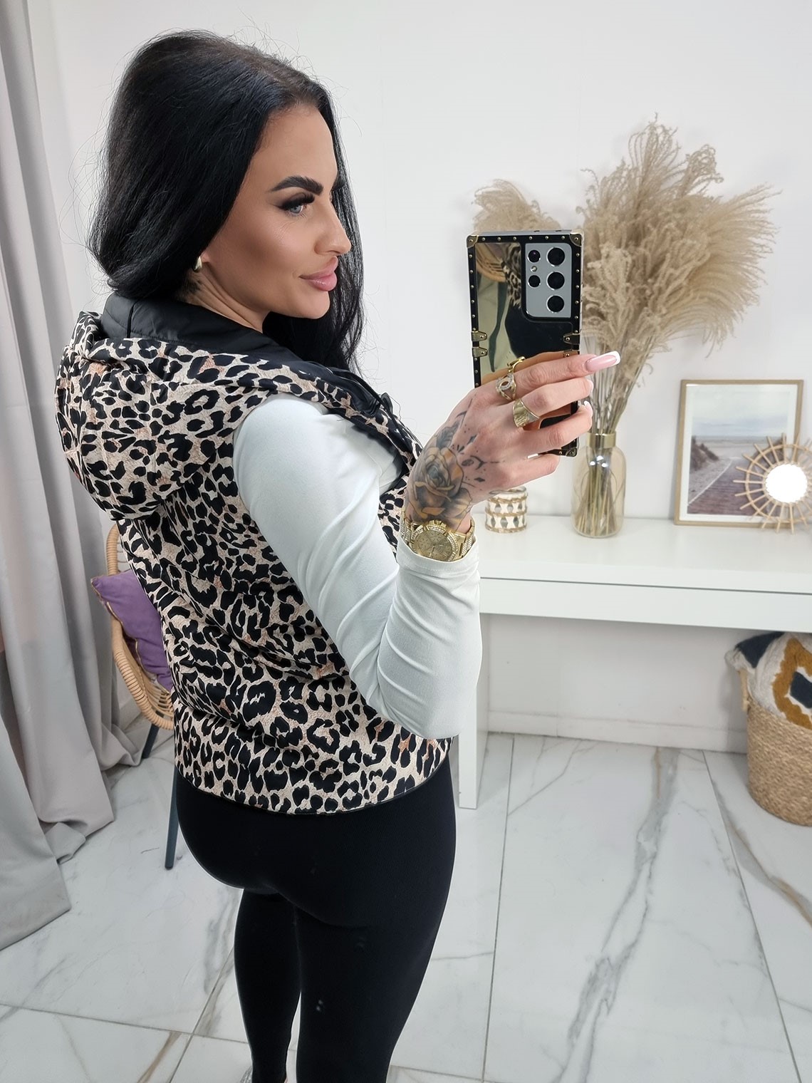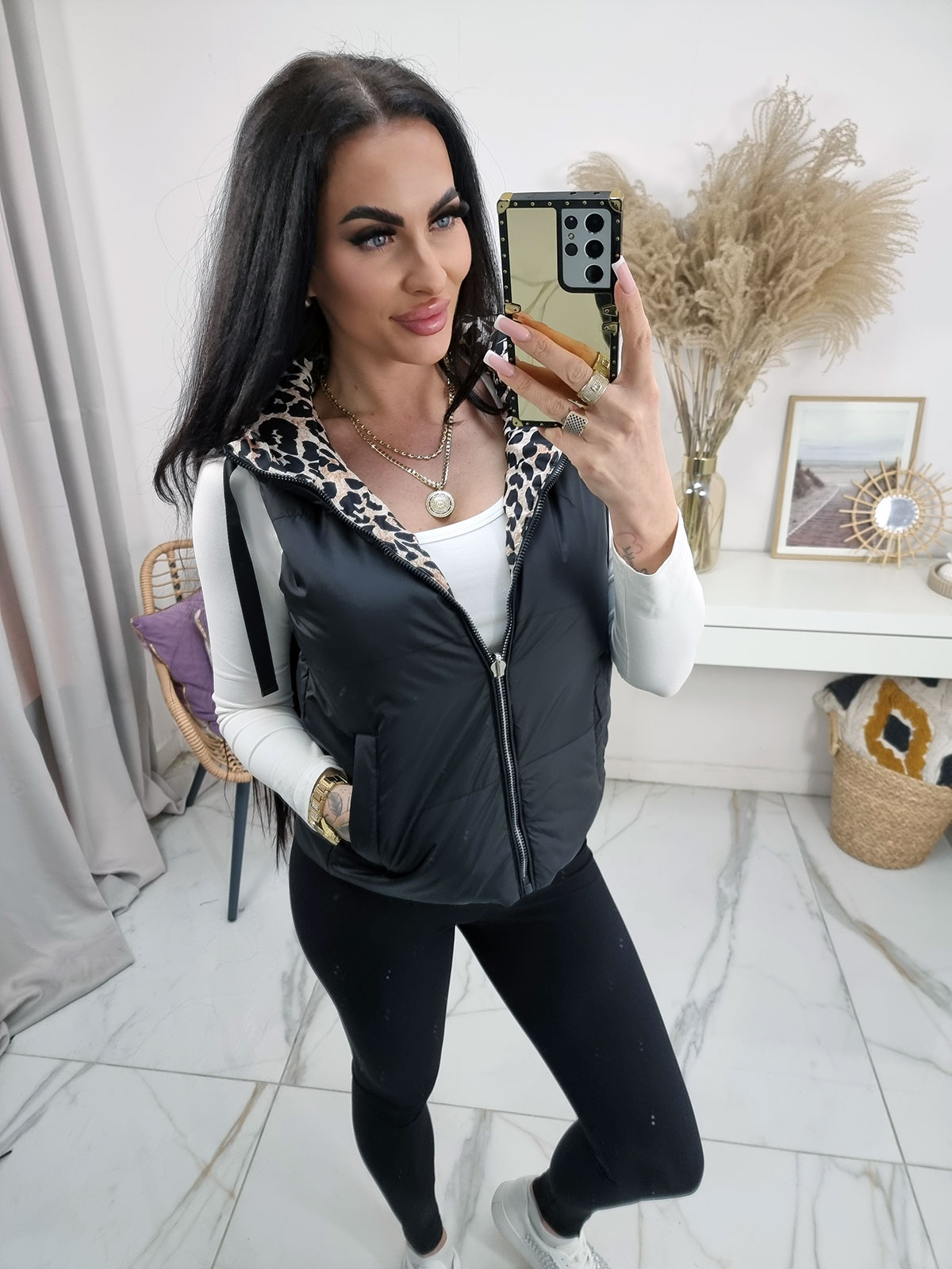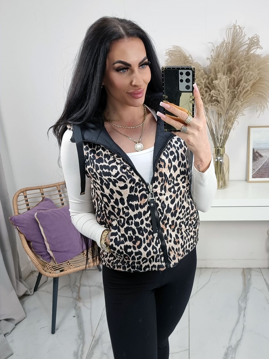 Krótka dwustronna kamizelka bezrękawnik Happy House z kapturem - czarna z panterką