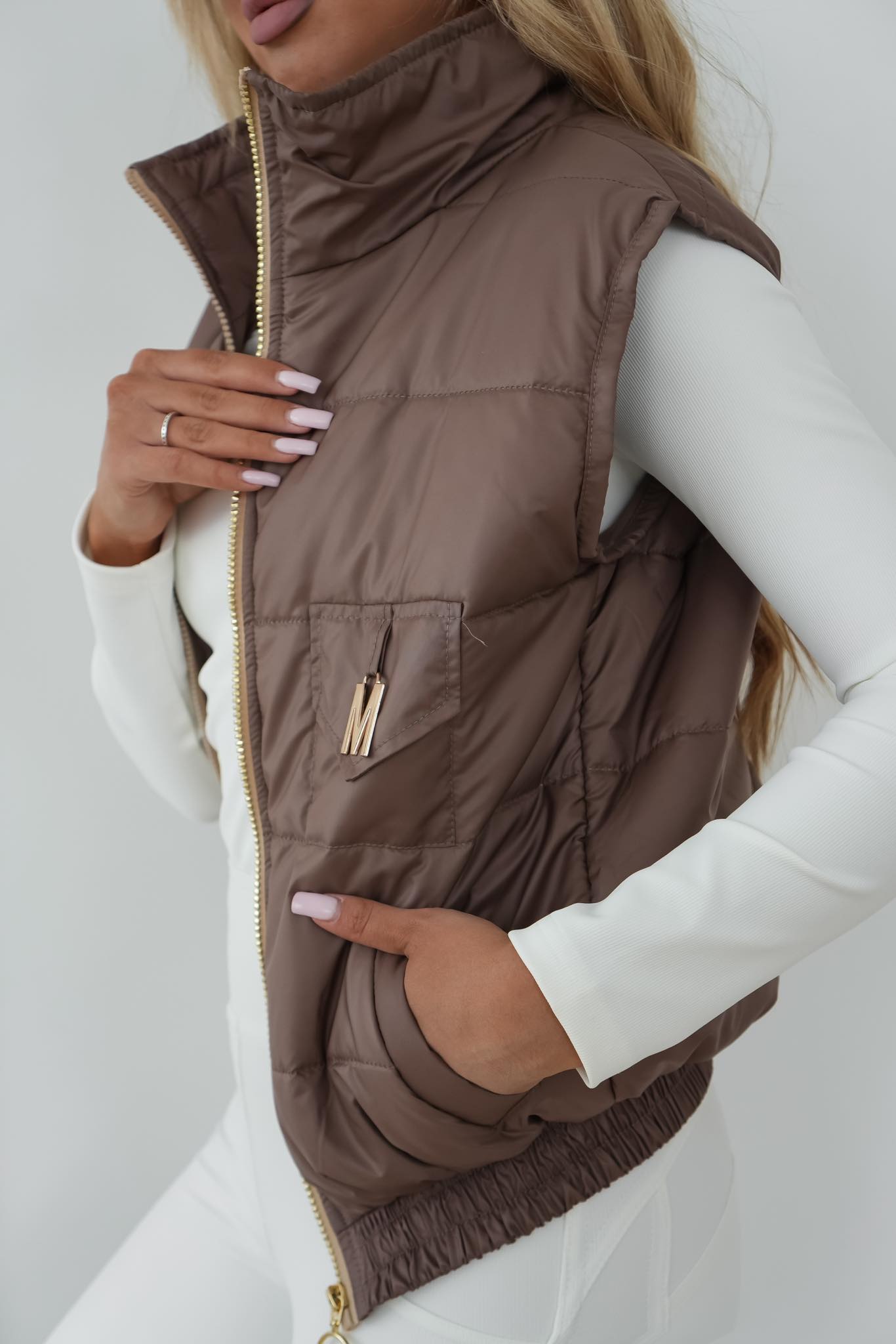 Pikowana kamizelka o krótkim fasonie, z zapięciem na zamek oraz kieszeniami z przodu. Idealna na chłodniejsze dni.