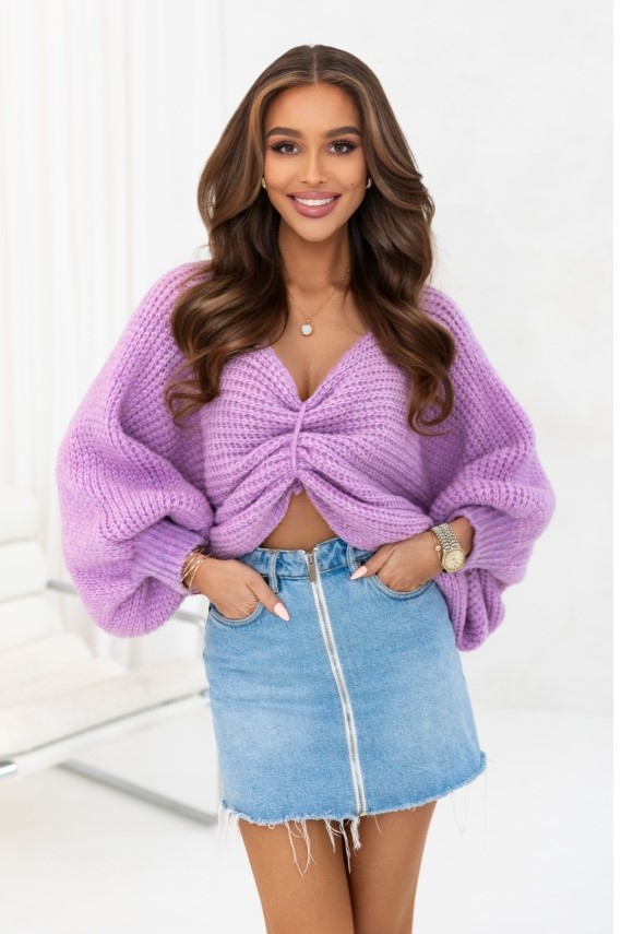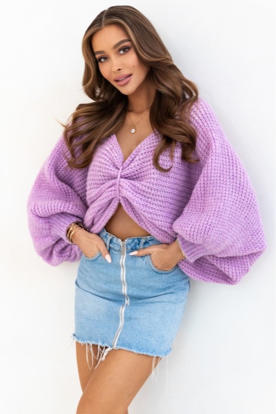 Krótki ozdobny sweter Cross z szerokimi rękawami polski produkt J&K premium - liliowy