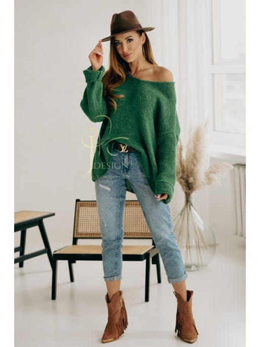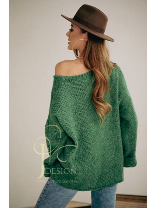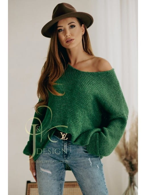 Luźny sweter w serek Neli polski producent J&K premium - zielony