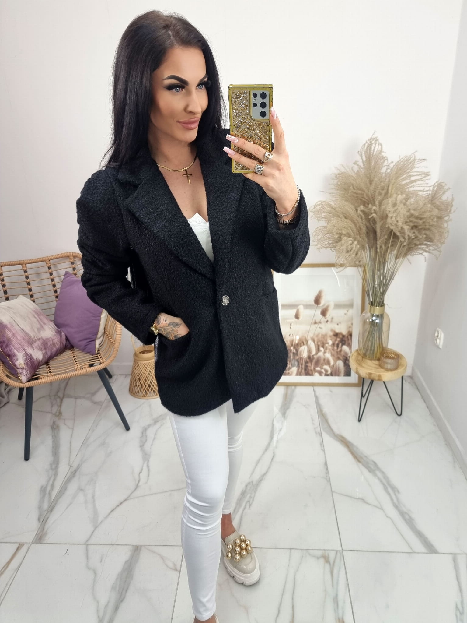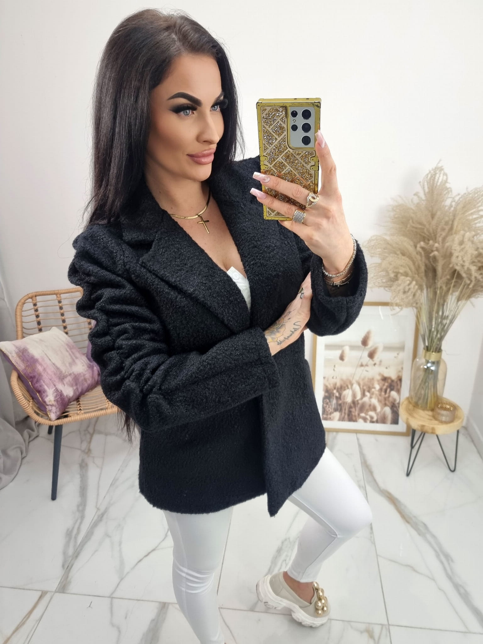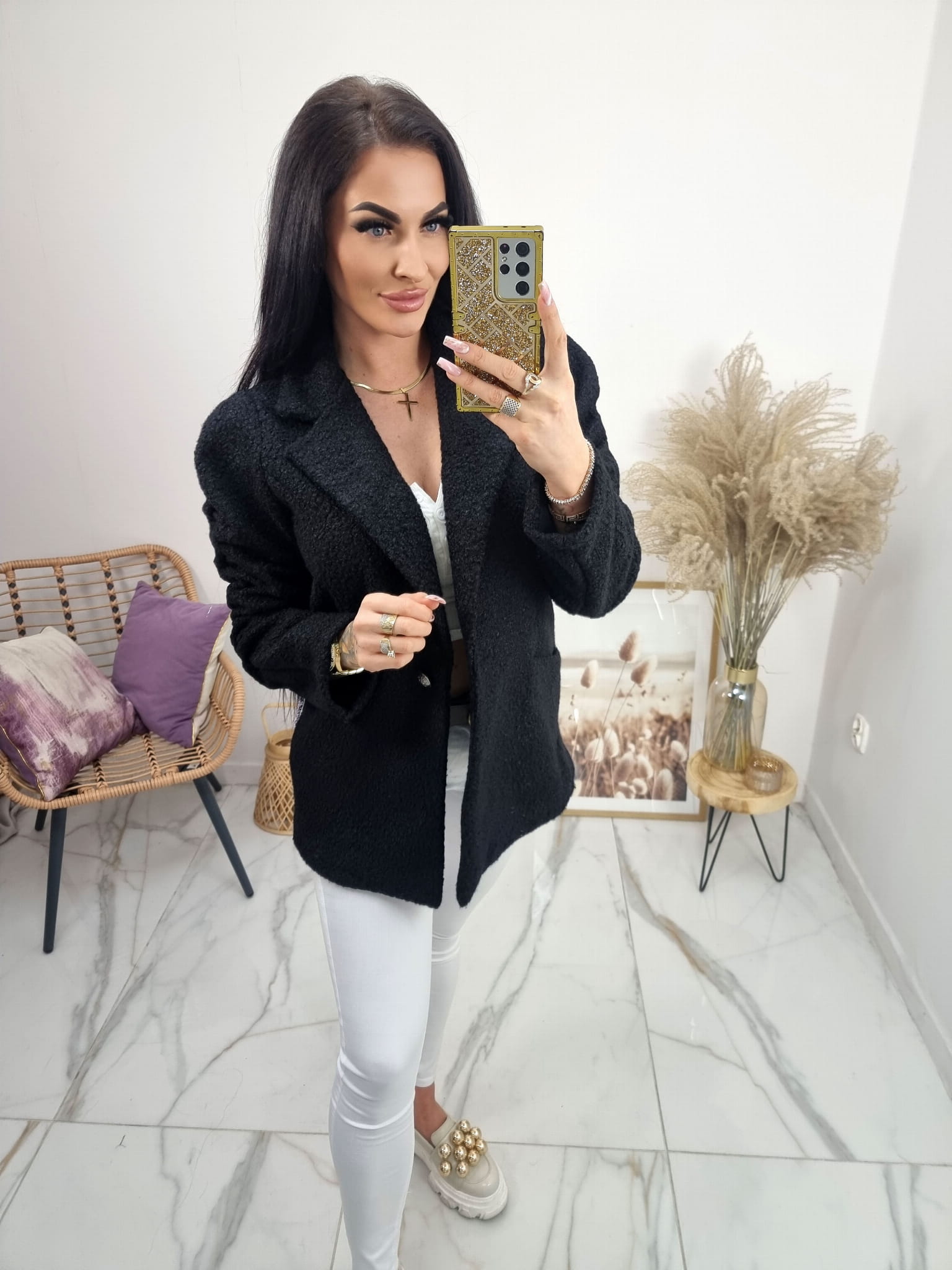 Bardzo modny w tym sezonie krótki płaszczyk a'la żakiet z materiału bukla (baranek).