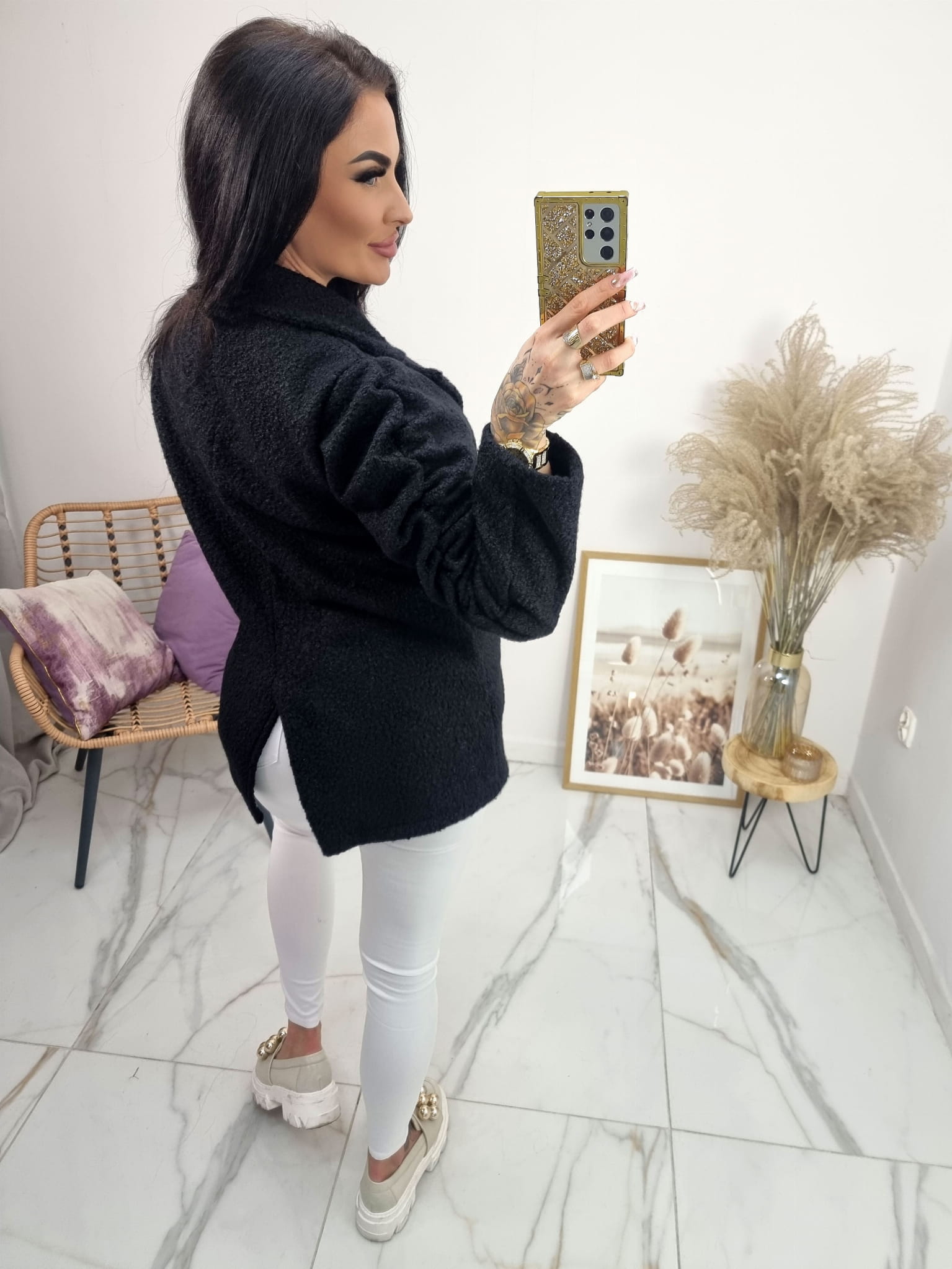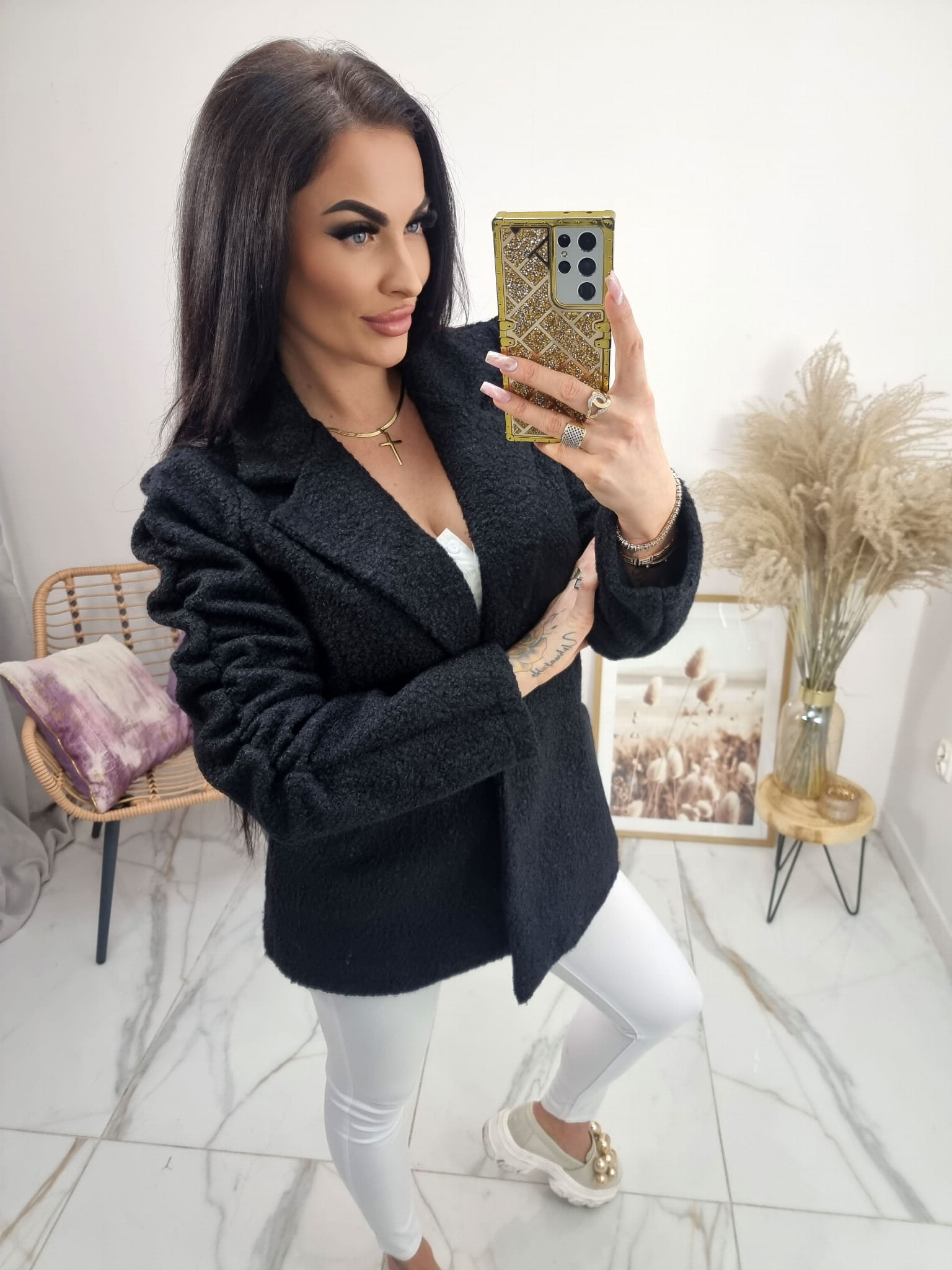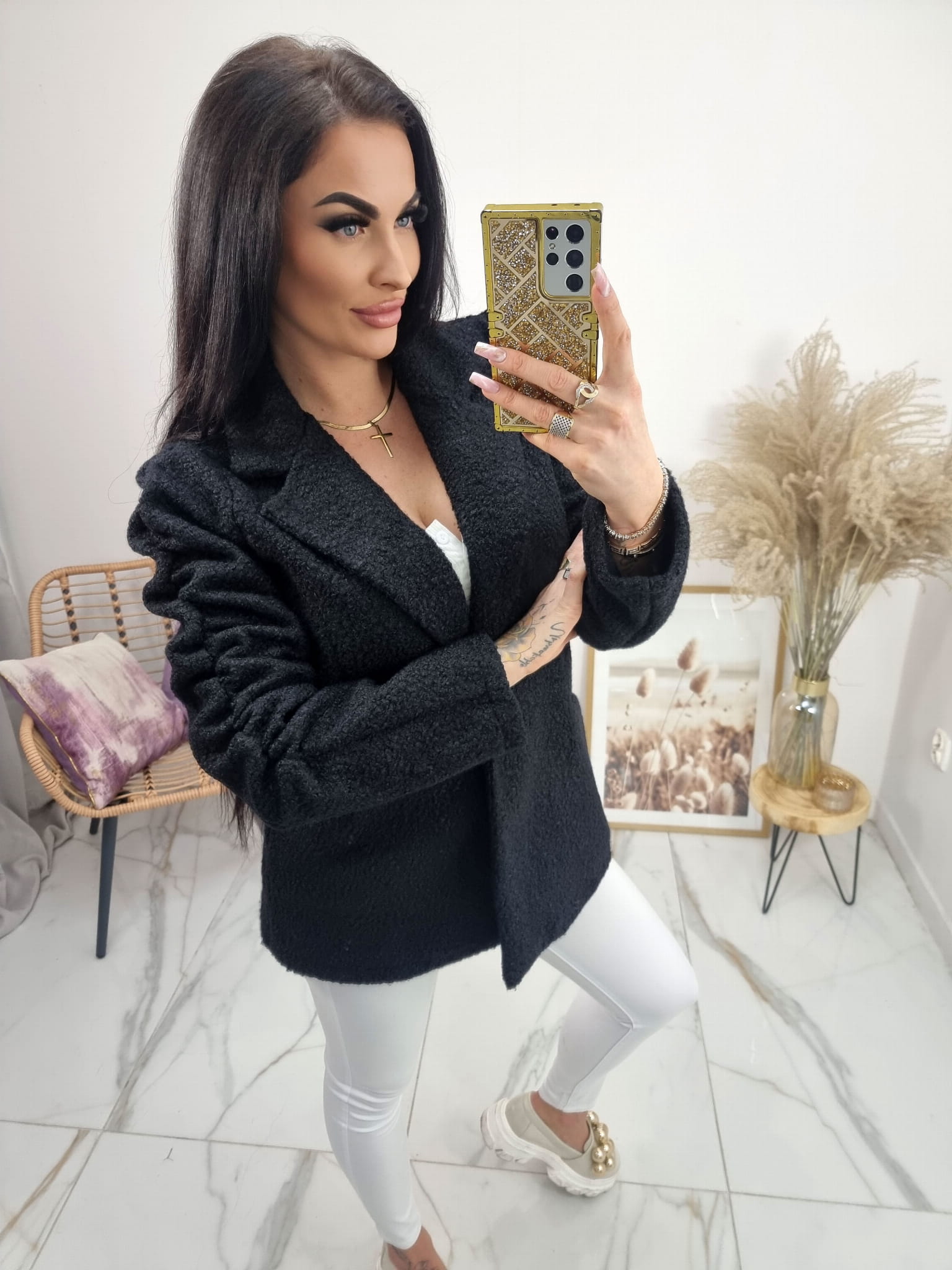 Bardzo modny w tym sezonie krótki płaszczyk a'la żakiet z materiału bukla (baranek).
