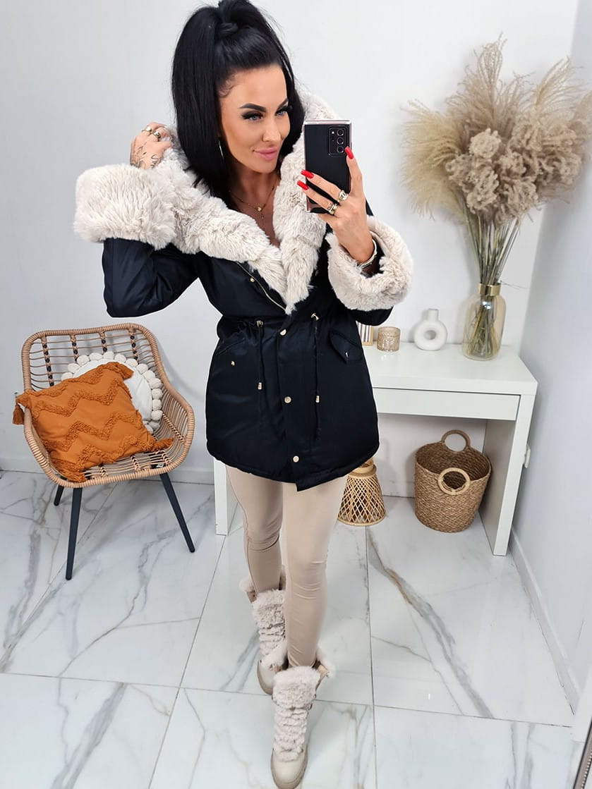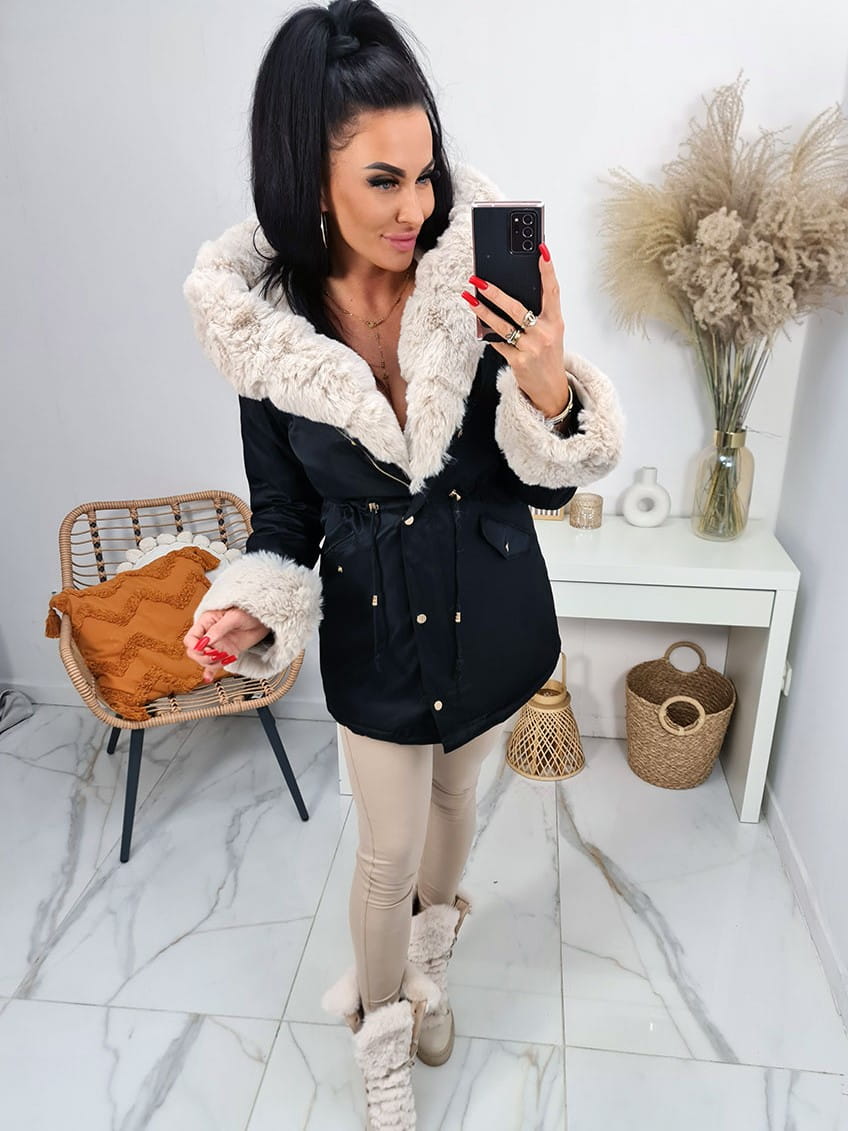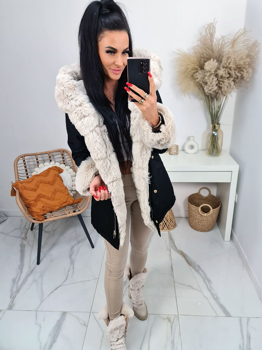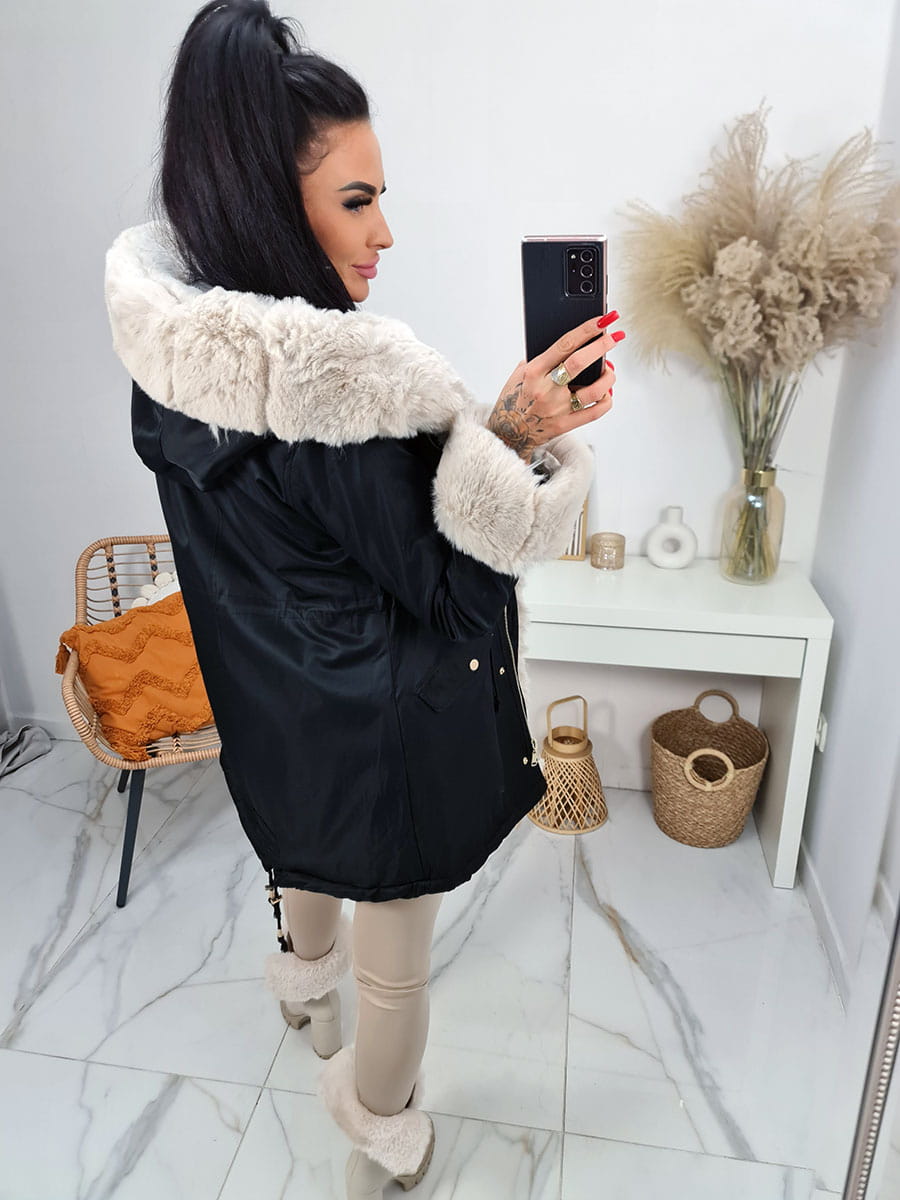 Parka kurtka zimowa Alaska z futrzanym kołnierzem i kapturem - czarna z beżowym futrem