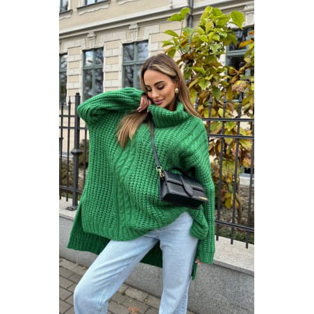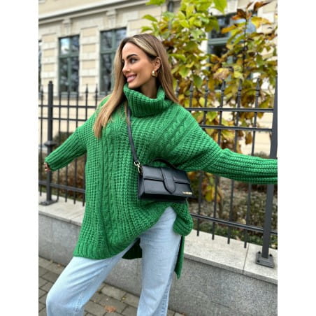Ten rewelacyjny sweter-golf to nasza propozycja zarówno na sezon wczesno wiosenny jak i jesienno-zimowy. Proponowany model jest o kroju oversize i pasuje rownież na sylwetkę o wymiarach plus size. Posiada wywijany golf oraz duże rozporki po bokach. Główną ozdobą tego swetra jest warkoczowy splot i asymetryczny wygląd.