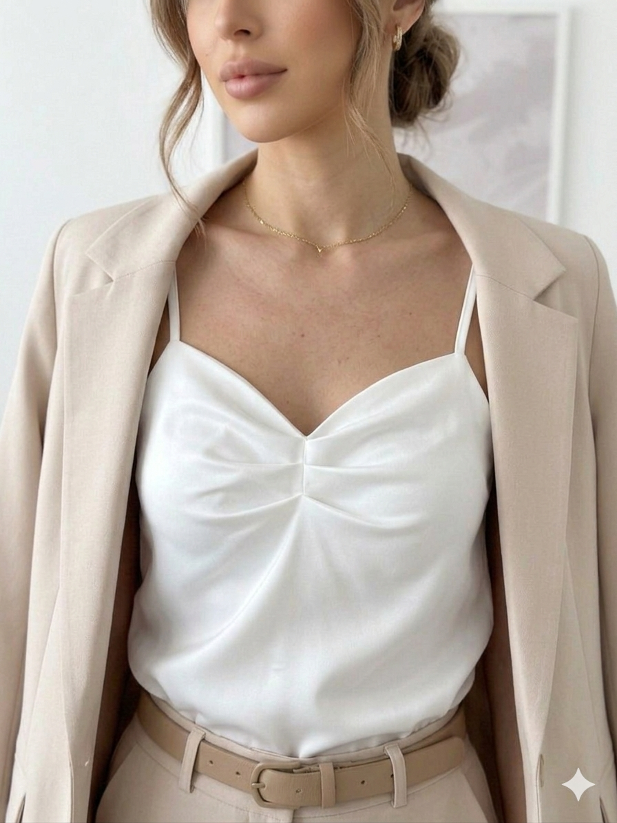 Top bluzka na ramiączka Pearls pod garnitur z marszczeniami - perłowy biały